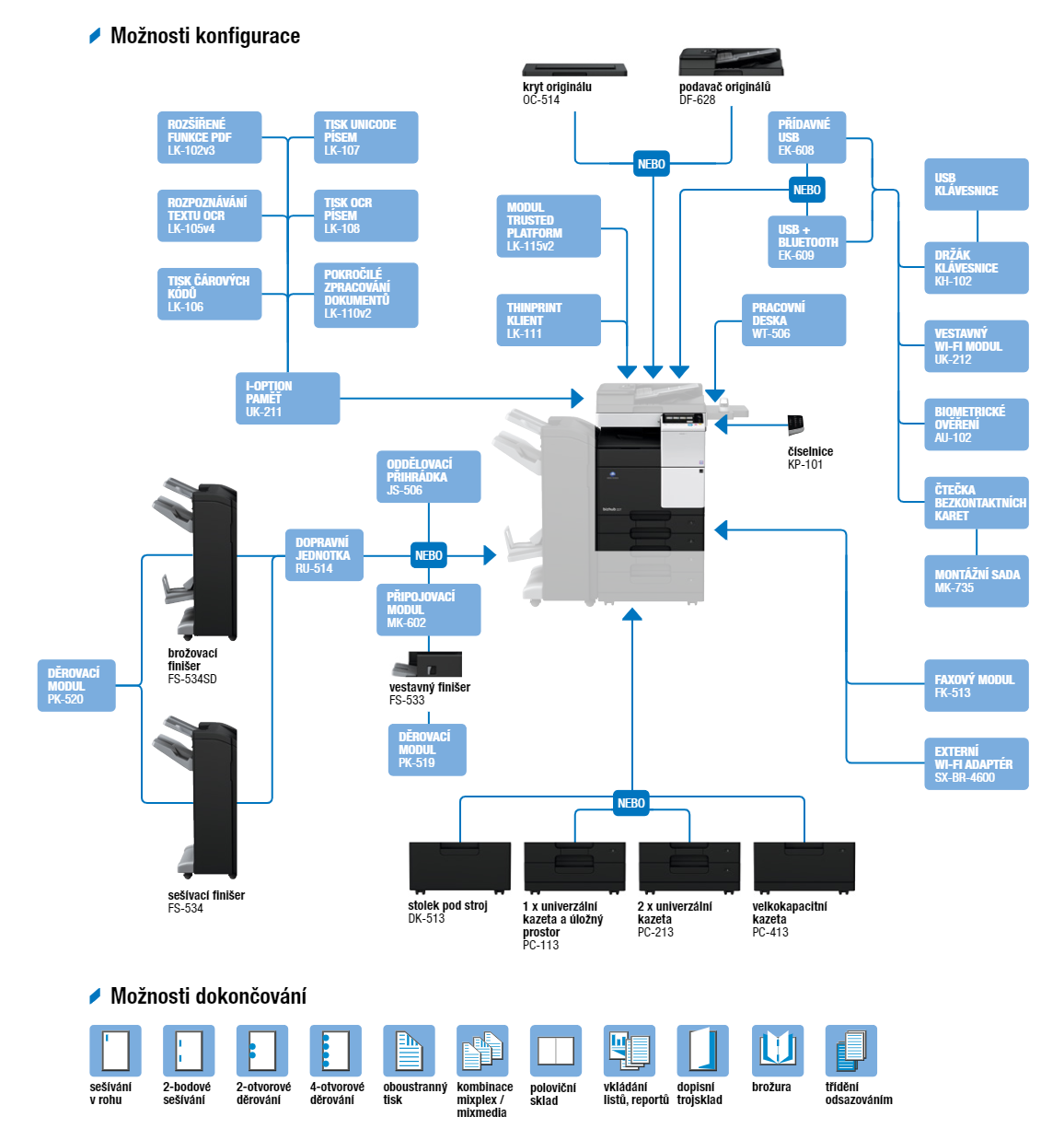 Tiskové funkce - přímý tisk souborů PCL, PS, TIFF, XPS, PDF 1.7, šifrovaných PDF a OOXML (DOCX, XLSX, PPTX); mixmedia a mixplex, ukládání přednastavení „Rychlé nastavení“, přetisk, vodoznak, ochrana proti kopírování, „průklepový“ tisk